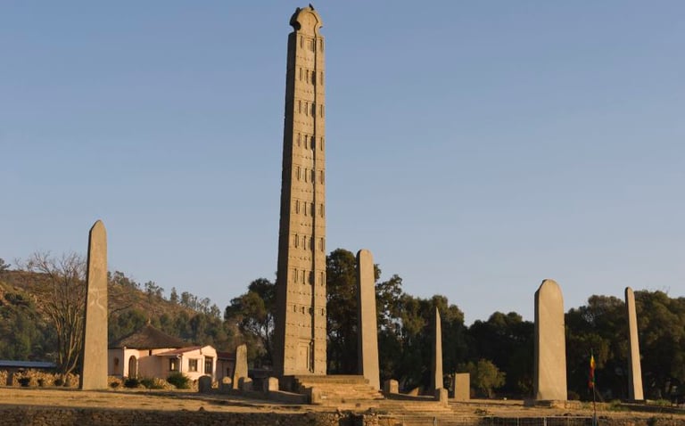 Route pour Axoum et découverte des vestiges axoumites : monolithes et inscriptions, chambres funéraires, ruines de palais et tombeaux.