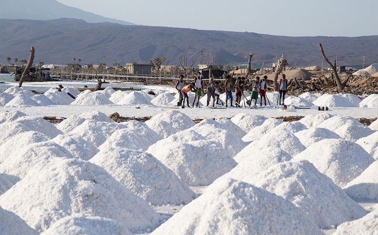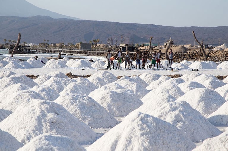 Réveil très matinal afin de profiter, depuis le sommet de la caldeira, du lever du jour. Descente pour rejoindre nos 4x4. Traversée du désert du Danakil du sud vers le nord, alternant piste et hors-piste, jusqu’à Ahmed Ila, où vivent les travailleurs du sel. L’après-midi, découverte du site de Dallol et de ses formations géologiques spectaculaires, suivie d’une randonnée pour explorer ses zones les plus caractéristiques. Retour à Ahmed Ila.