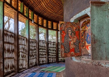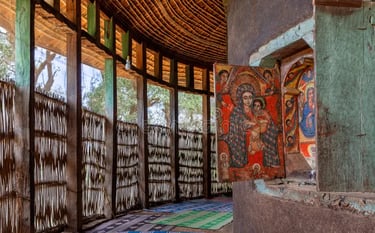 Visite du monastère Ura Kidane Meret, remarquable exemple d’architecture et de peinture religieuse éthiopienne et de son musée abritant une collection de croix remontant au 14ème siècle. Promenade parmi les caféiers et manguiers jusqu’à l’église Azoua Mariam et retour en bateau.
