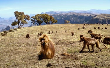 Route vers Débark et Enregistrement auprès des autorités du parc et transfert jusque Sankaber.Observation de colonie de babouins Gelada, grands singes des hauts plateaux éthiopiens.